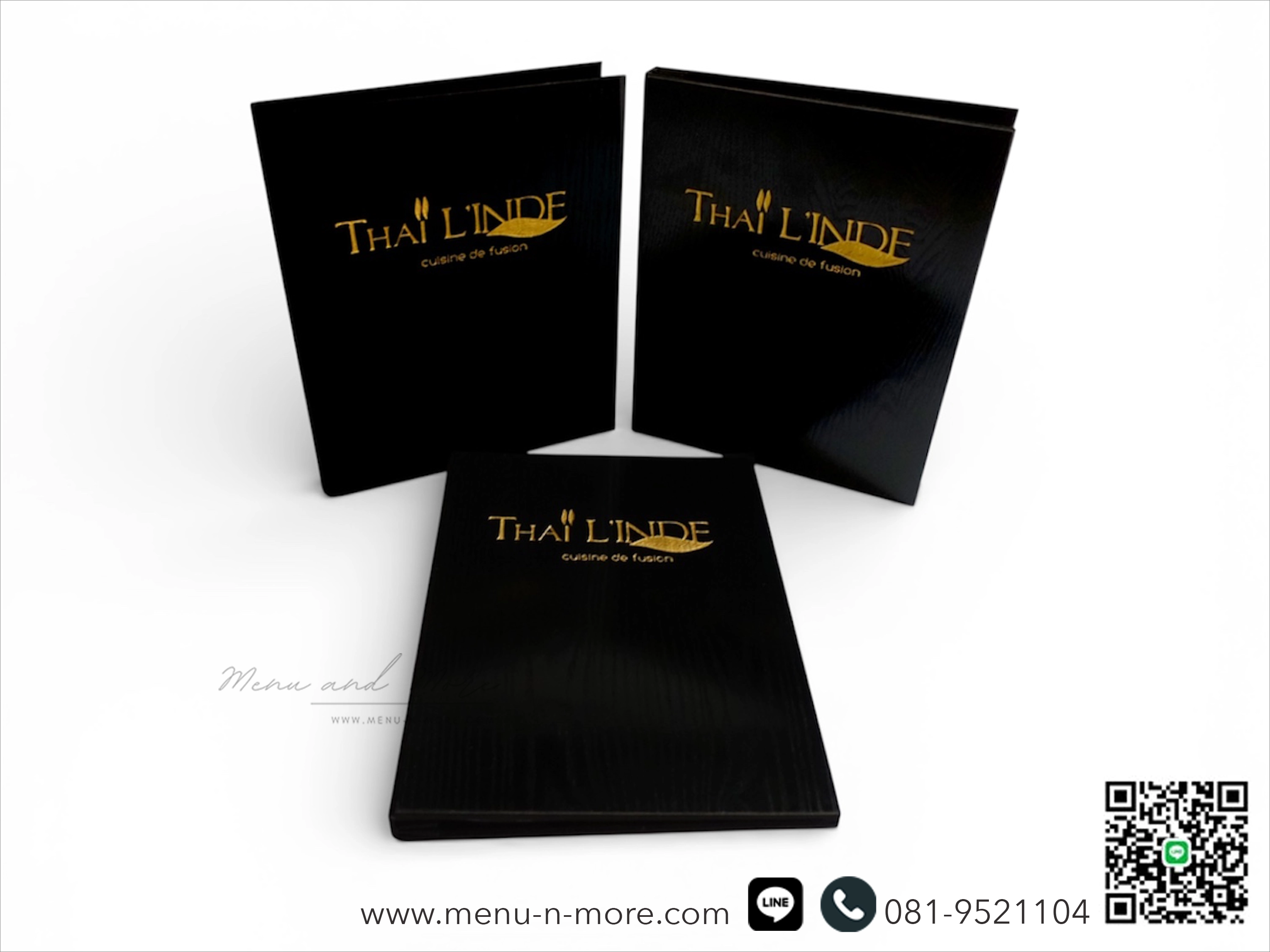เลเซอร์ลงสีทองชื่อร้านอาหารบนแฟ้มเมนู เพิ่มความจดจำ ให้กับลูกค้าที่มาใช้บริการThe restaurant name was laser engraved in gold to increase recognition among customers who used the service.