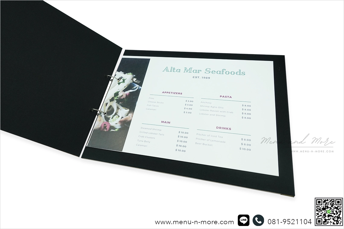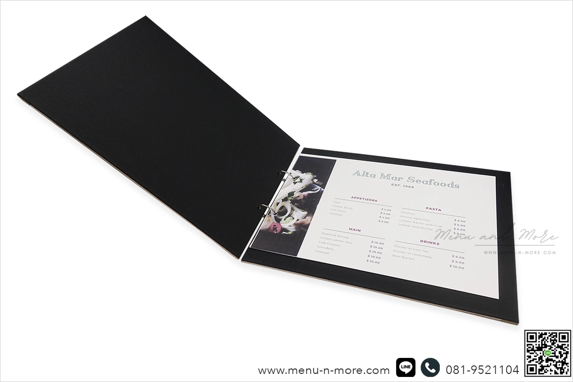 แฟ้มเมนูแต่ละเล่มผ่านการขัดเงาด้วยมือ ดังนั้นสีของเมนูจึงอาจแตกต่างกันไป